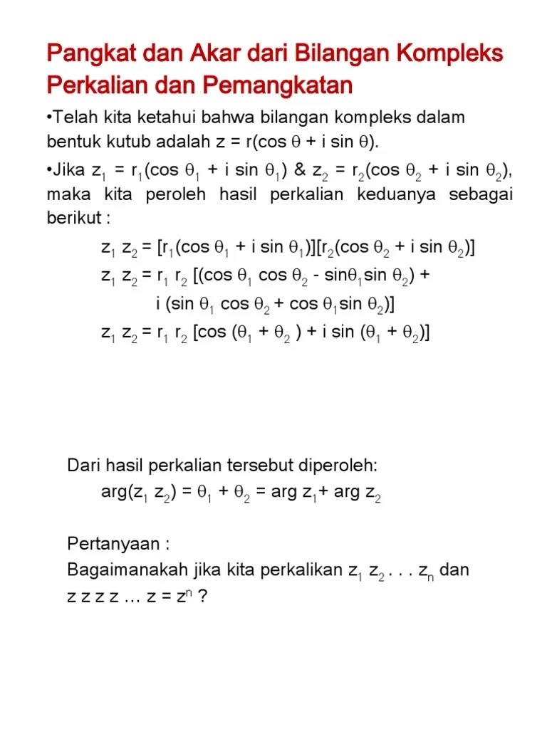 Bagian real dan bagian imaginer dari bilangan kompleks. Apakah bilangan imajiner itu ? Cara penyelesaiannya dengan menggunakan rumus abc, yang menghasilkan dua akar . Sehingga kedua bagian di atas membentuk bilangan kompleks. ) n sin( i ) n cos( r z n n u + u = contoh: